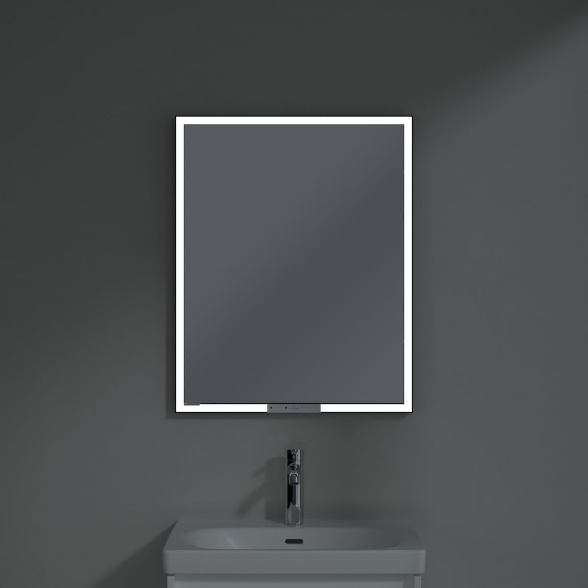 Das den Spiegel umgebende LED-Band sorgt für eine gleichmäßige Ausleuchtung, während die integrierte Waschtischbeleuchtung und die beleuchteten offenen Fächer eine stimmungsvolle Atmosphäre schaffen. Helligkeit und Farbtemperatur lassen sich bequem über einen Sensor oder eine Smart-Home-Steuerung regulieren. Die filigranen Griffe ermöglichen ein komfortables Öffnen der Türen ohne Fingerabdrücke, und die doppelte Steckdose im Inneren sorgt für zusätzliche Funktionalität.