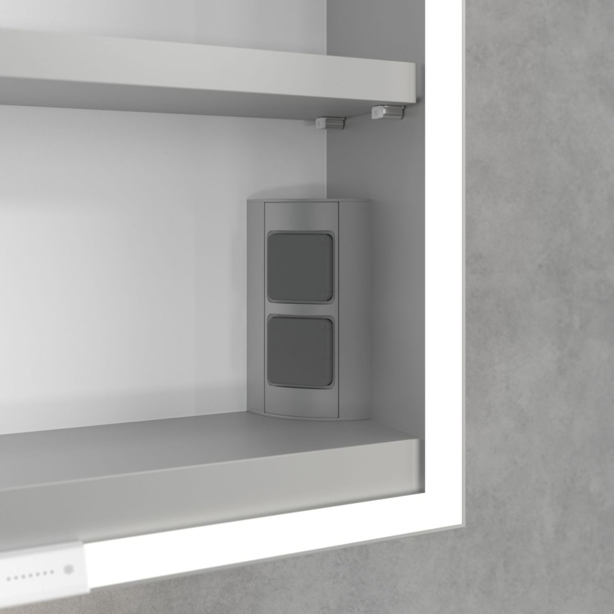 Das den Spiegel umgebende LED-Band sorgt für eine gleichmäßige Ausleuchtung, während die integrierte Waschtischbeleuchtung und die beleuchteten offenen Fächer eine stimmungsvolle Atmosphäre schaffen. Helligkeit und Farbtemperatur lassen sich bequem über einen Sensor oder eine Smart-Home-Steuerung regulieren. Dezente Griffe ermöglichen ein bequemes Öffnen der Türen ohne Fingerabdrücke, und eine doppelte Steckdose im Inneren sorgt für zusätzliche Funktionalität.