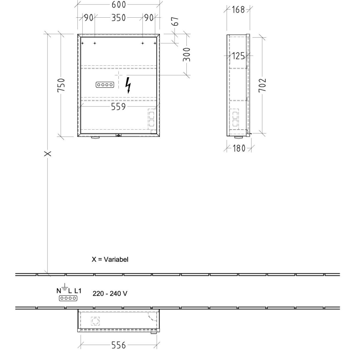 - Ausstattung: 1 x Tür, 1 x Sensorschalter außen, 2 x Steckdose innen, 4 x Aluminiumregale, 1 x offenes Fach rechts unten, 1 x Behälter, 1 x Vergrößerungsspiegel, 1 x Magnetleiste- Material des Korpus: Aluminium