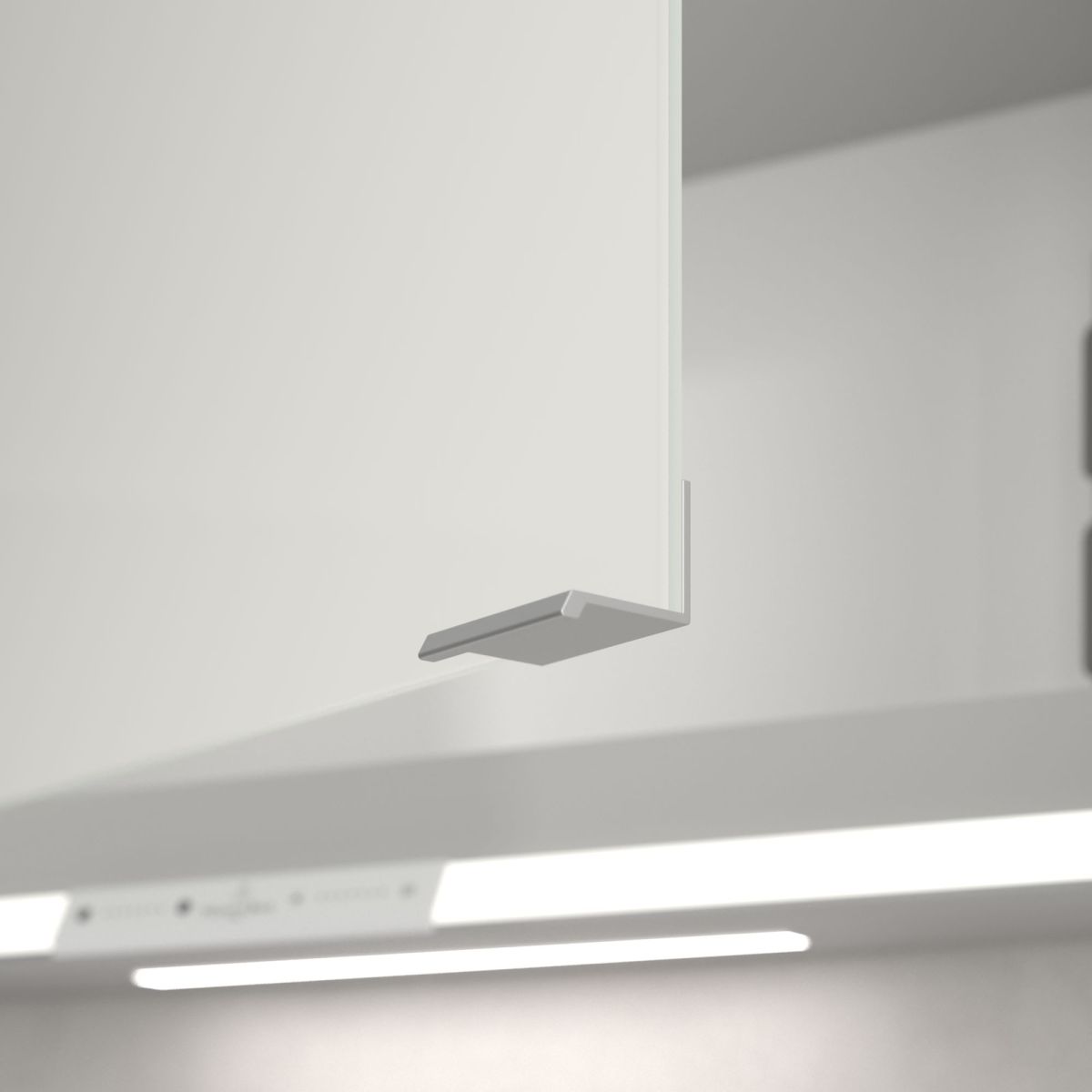 Das den Spiegel umgebende LED-Band sorgt für eine gleichmäßige Ausleuchtung, während die integrierte Waschtischbeleuchtung und die beleuchteten offenen Fächer eine stimmungsvolle Atmosphäre schaffen. Helligkeit und Farbtemperatur lassen sich bequem über einen Sensor oder eine Smart-Home-Steuerung regulieren. Dezente Griffe ermöglichen ein bequemes Öffnen der Türen ohne Fingerabdrücke, und eine doppelte Steckdose in der Mitte sorgt für zusätzliche Funktionalität.