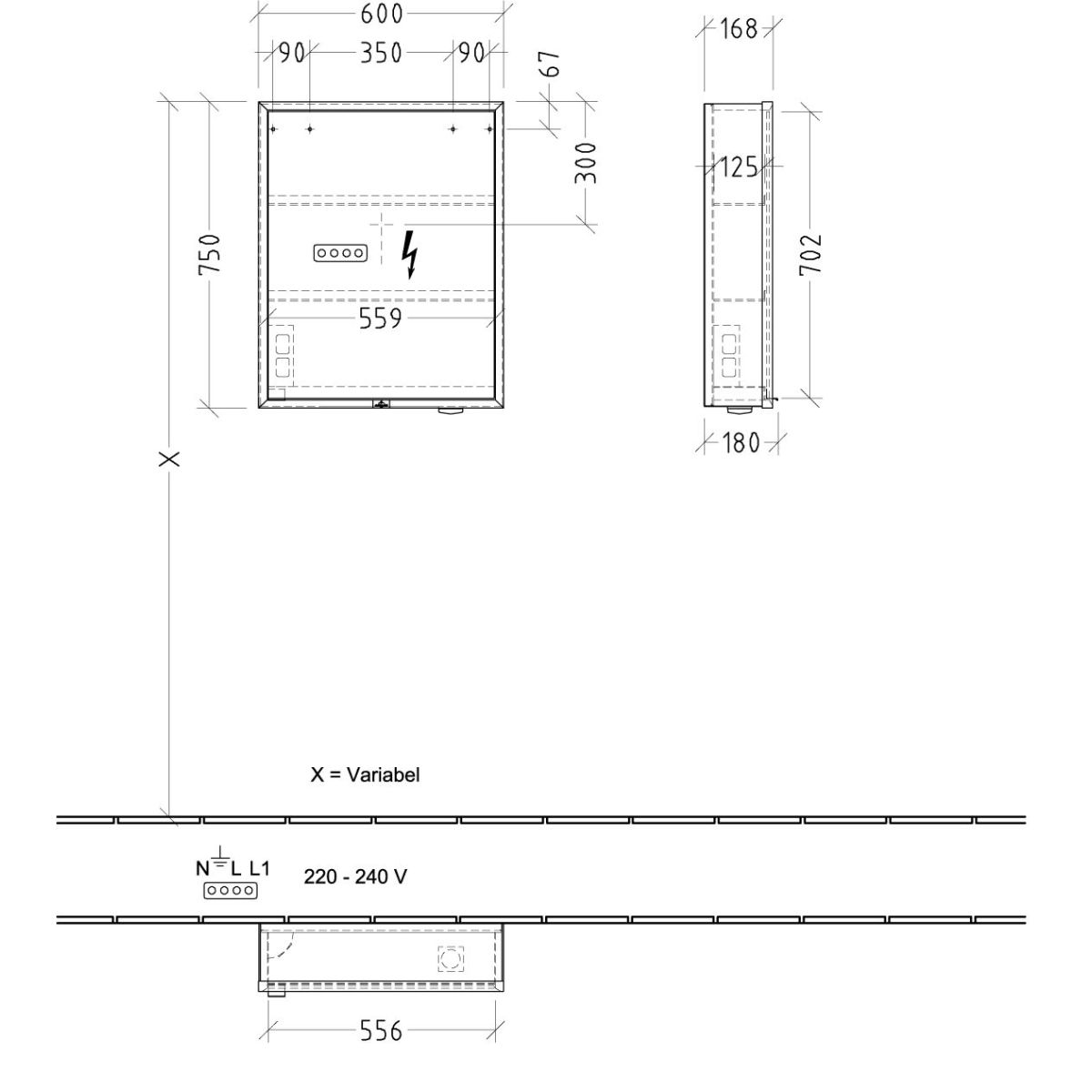 - Ausstattung: 1 x Tür, 1 x Sensorschalter außen, 2 x Steckdose innen, 4 x Aluminiumregale, 1 x offenes Fach rechts unten, 1 x Behälter, 1 x Vergrößerungsspiegel, 1 x Magnetleiste- Material des Korpus: Aluminium