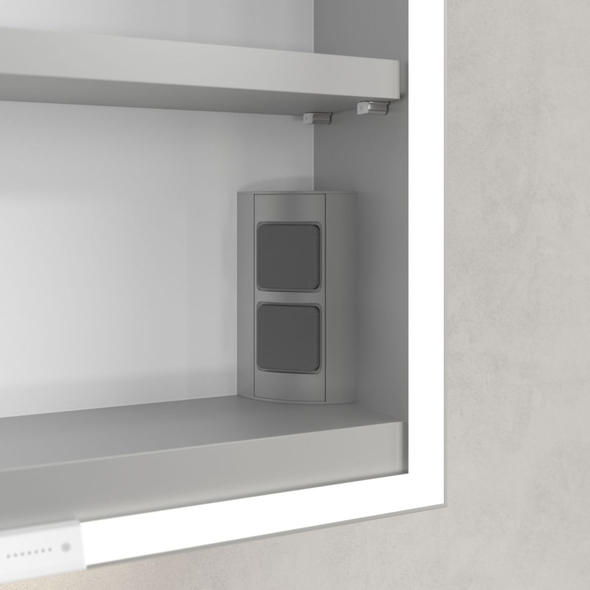 Das den Spiegel umgebende LED-Band sorgt für eine gleichmäßige Ausleuchtung, während die integrierte Waschtischbeleuchtung und die beleuchteten offenen Fächer eine stimmungsvolle Atmosphäre schaffen. Helligkeit und Farbtemperatur lassen sich bequem über einen Sensor oder eine Smart-Home-Steuerung regulieren. Dezente Griffe ermöglichen ein komfortables Öffnen der Türen ohne Fingerabdrücke, und eine doppelte Steckdose im Inneren sorgt für zusätzliche Funktionalität.