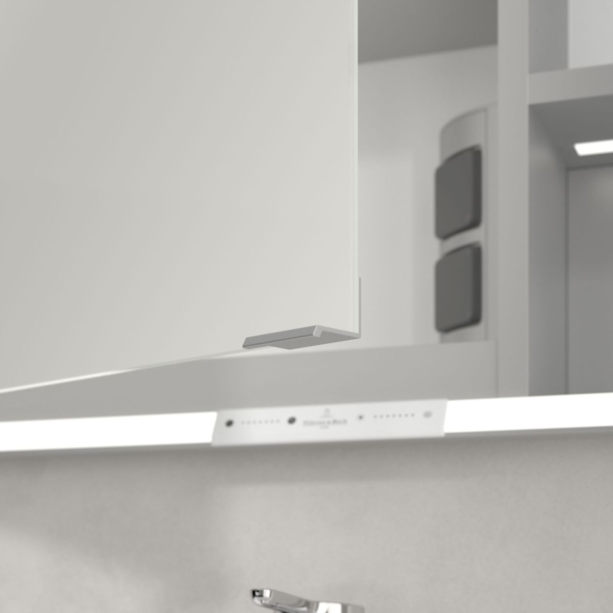 Eine raffinierte und attraktive Lösung für das minimalistische Badezimmer – der Einbau-Spiegelschrank My View+ von Villeroy & Boch setzt mit intelligenten Funktionen und stilvollen Farbakzenten neue Maßstäbe. Der Schrank mit geschlossenen Fächern und offenen Kammern fügt sich perfekt in die Wand ein und sorgt für einen besonders eleganten, minimalistischen Effekt. Die farbige Rückwand setzt individuelle Farbakzente und Designelemente im Badezimmer.