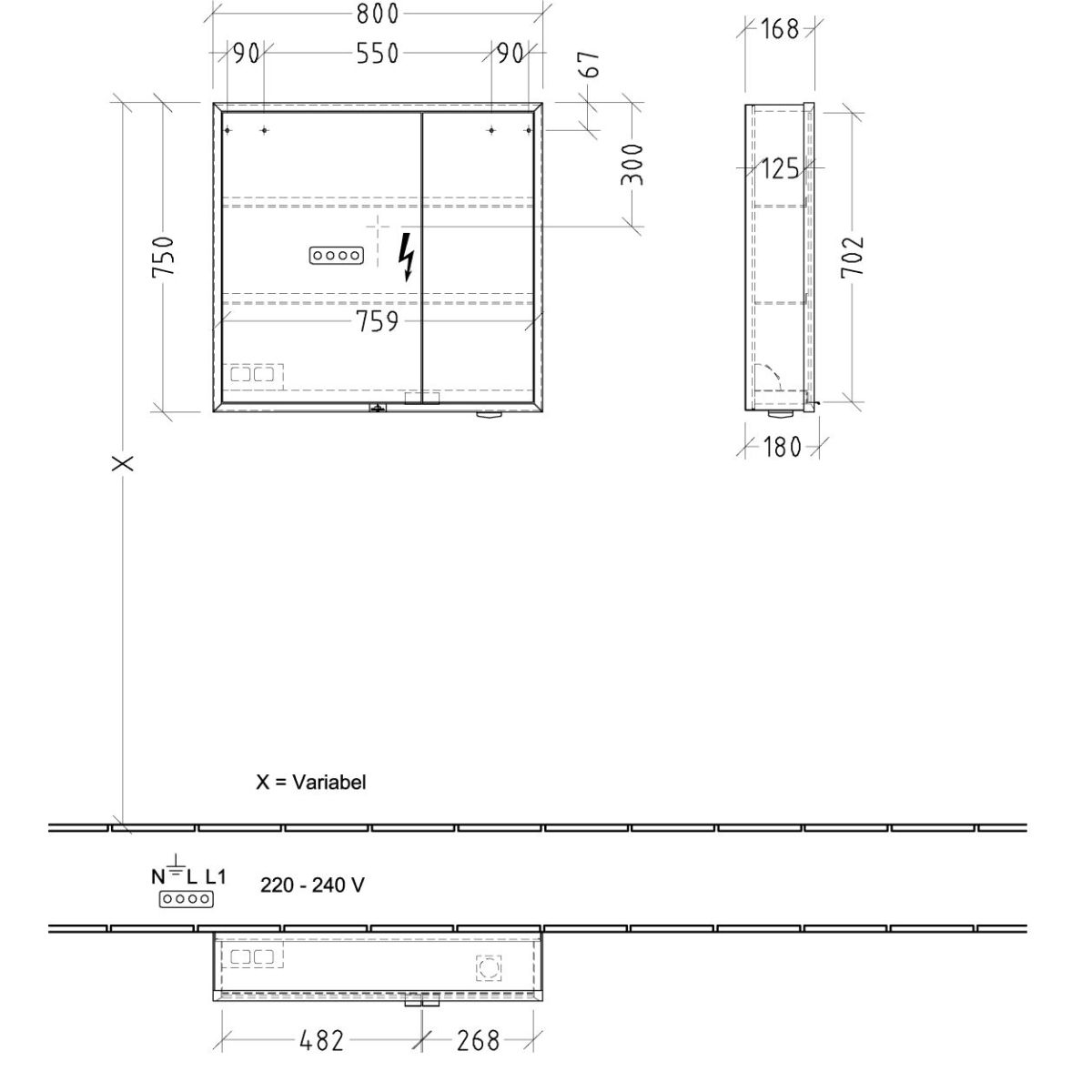- Ausstattung: 2 x Türen, 1 x Sensorschalter außen, 2 x Steckdose innen, 4 x Aluminium-Einlegeböden, 1 x offenes Fach rechts unten, 1 x Behälter, 1 x Vergrößerungsspiegel, 1 x Magnetleiste- Material des Korpus: Aluminium