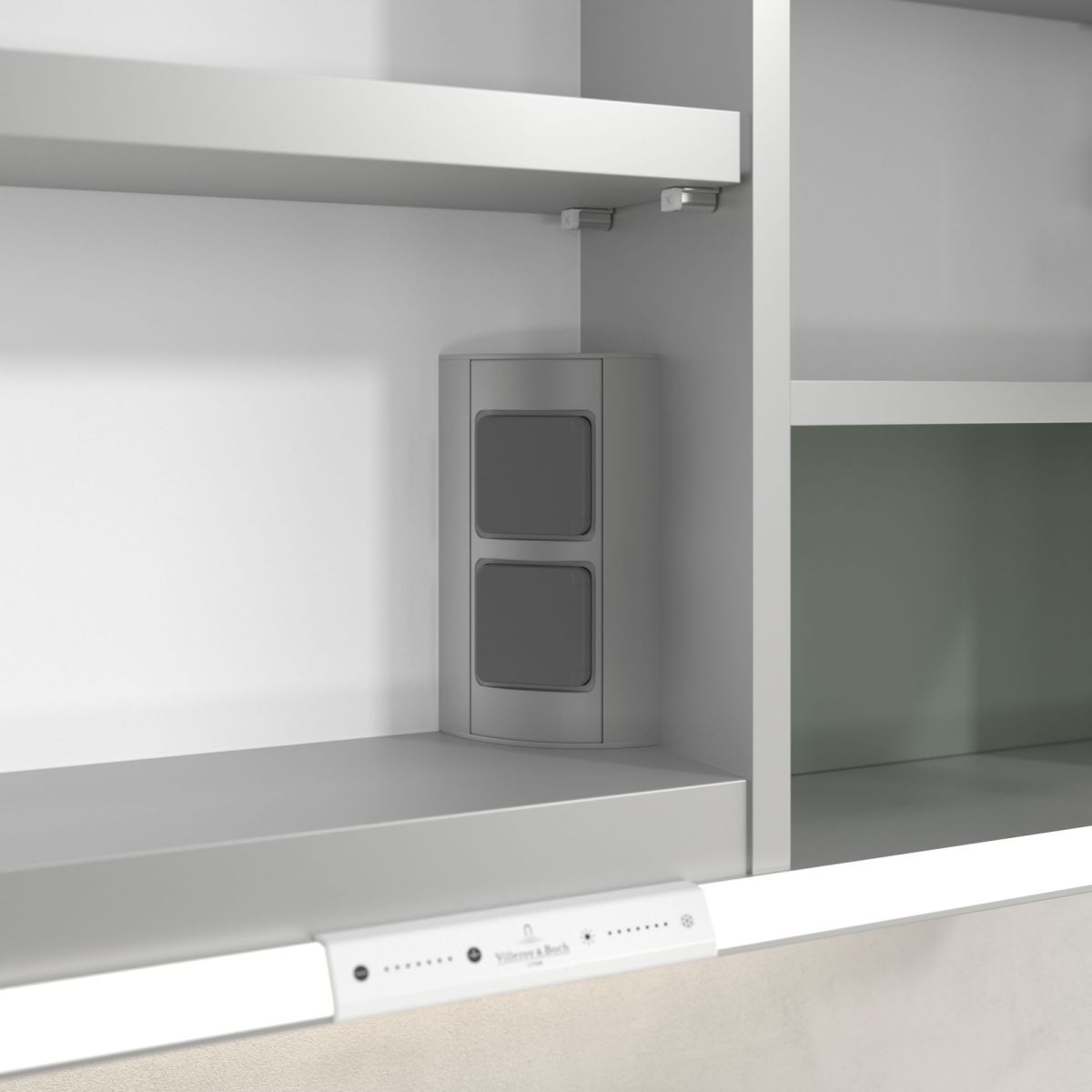 Das den Spiegel umgebende LED-Band sorgt für eine gleichmäßige Ausleuchtung, während die integrierte Waschtischbeleuchtung und die beleuchteten offenen Fächer eine stimmungsvolle Atmosphäre schaffen. Helligkeit und Farbtemperatur lassen sich bequem über einen Sensor oder eine Smart-Home-Steuerung regulieren. Dezente Griffe ermöglichen ein komfortables Öffnen der Türen ohne Fingerabdrücke, und eine doppelte Steckdose im Inneren sorgt für zusätzliche Funktionalität.