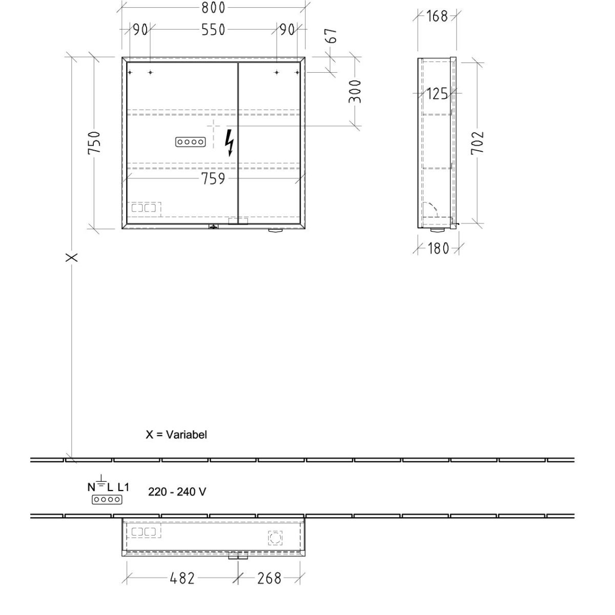 - Ausstattung: 2 x Türen, 1 x Sensorschalter außen, 2 x Steckdose innen, 4 x Aluminiumablagen, 1 x offenes Fach rechts unten, 1 x Behälter, 1 x Vergrößerungsspiegel, 1 x Magnetleiste- Material des Korpus: Aluminium
