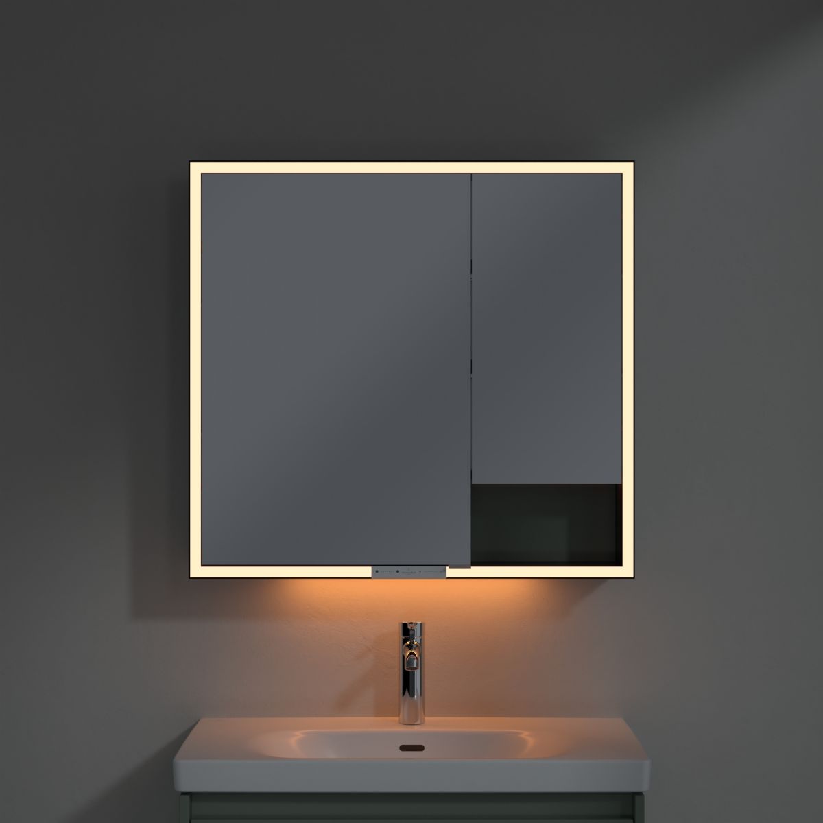Das den Spiegel umgebende LED-Band sorgt für eine gleichmäßige Ausleuchtung, während die integrierte Waschtischbeleuchtung und die beleuchteten offenen Fächer eine stimmungsvolle Atmosphäre schaffen. Helligkeit und Farbtemperatur lassen sich bequem über einen Sensor oder eine Smart-Home-Steuerung regulieren. Die filigranen Griffe ermöglichen ein komfortables Öffnen der Türen ohne Fingerabdrücke, und die doppelte Steckdose im Inneren sorgt für zusätzliche Funktionalität.