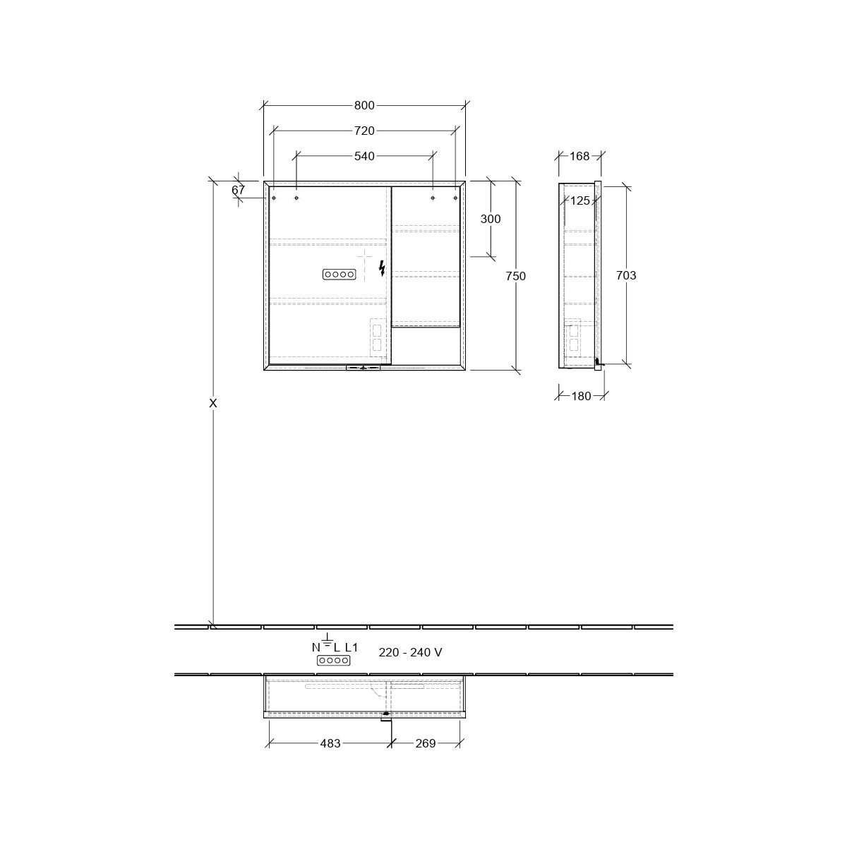 - Ausstattung: 2 x Türen, 1 x Sensorschalter außen, 2 x Steckdose innen, 4 x Ablagen aus Aluminium, 1 x offenes Fach rechts unten, 1 x Behälter, 1 x Vergrößerungsspiegel, 1 x Magnetleiste