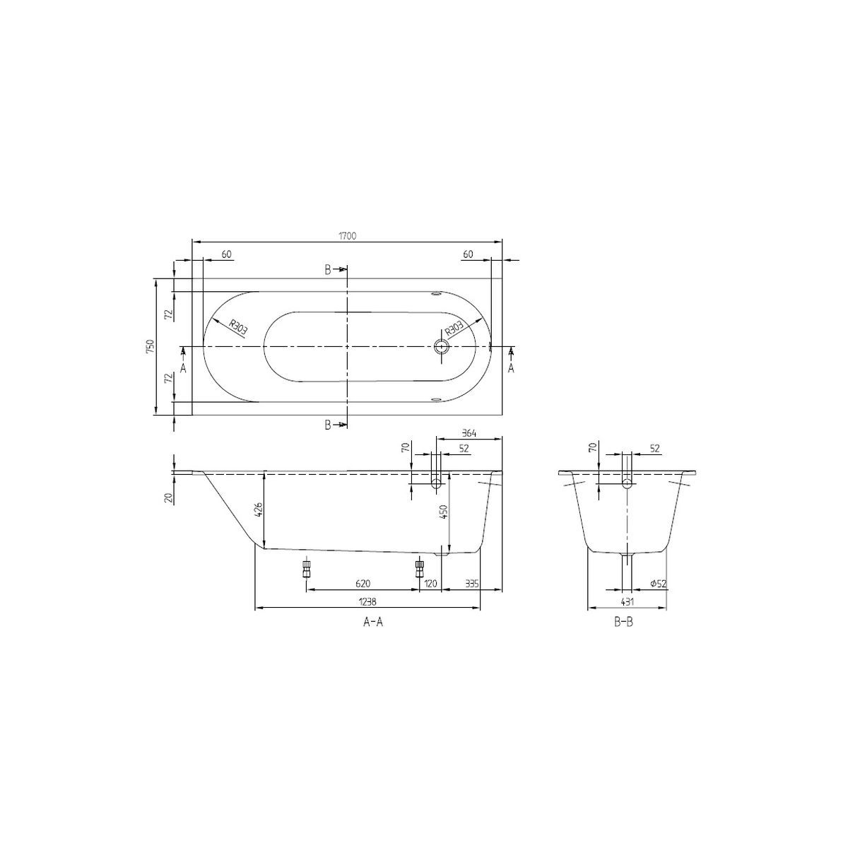 Villeroy & Boch Oberon Rechteckige Badewanne 170x75 cm weiß UBQ170OBE2V-RW