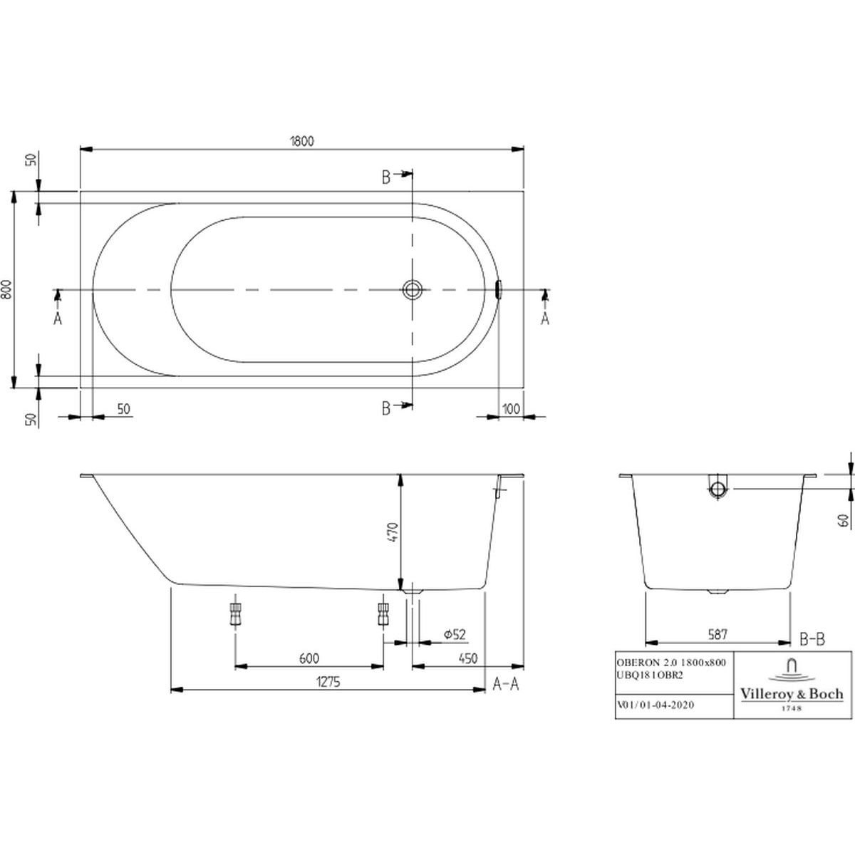 Villeroy & Boch Oberon Rechteckige Badewanne 180x80 cm weiß UBQ181OBR2DV-01