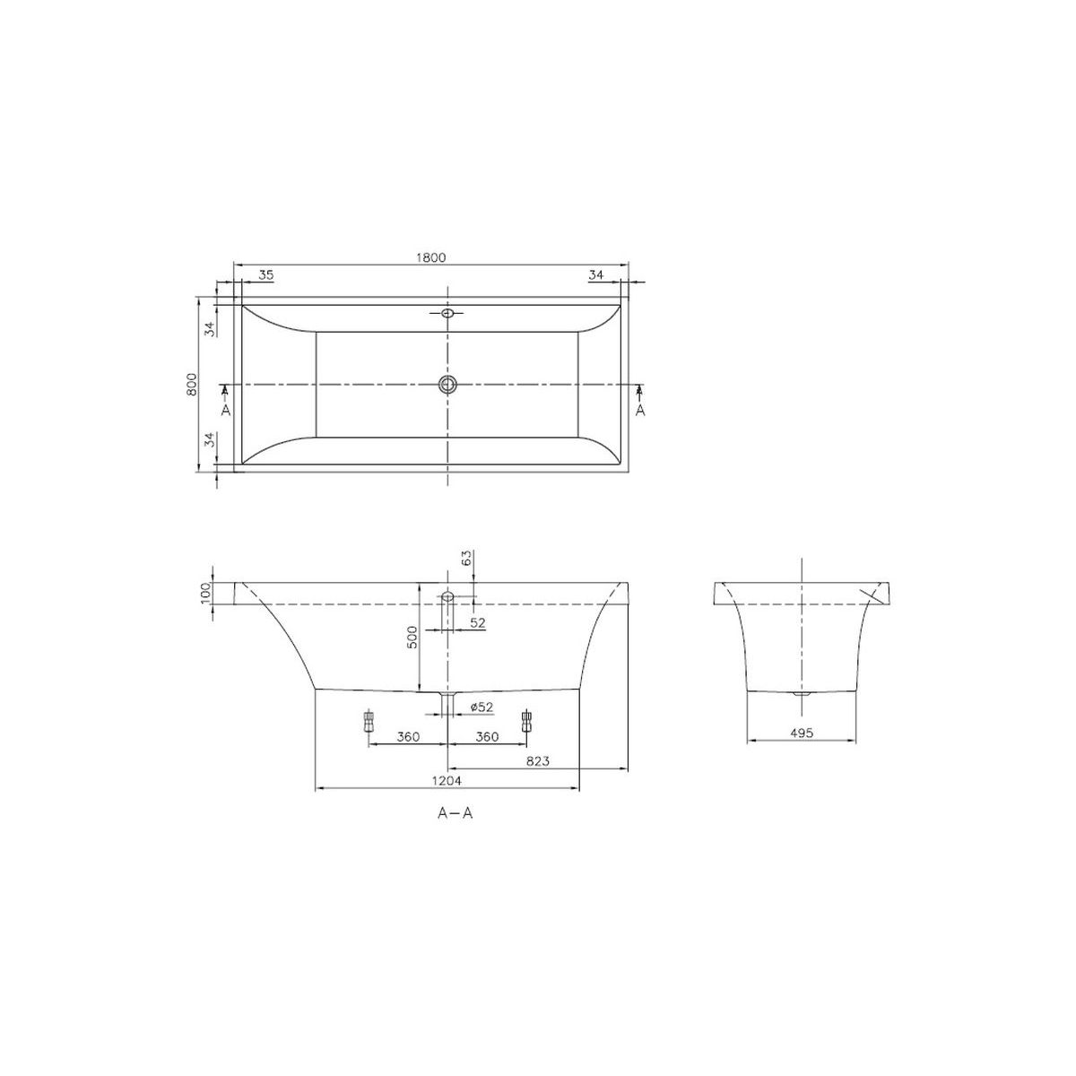 - Maße des Wannenbodens: 120,4 x 49,5 cm