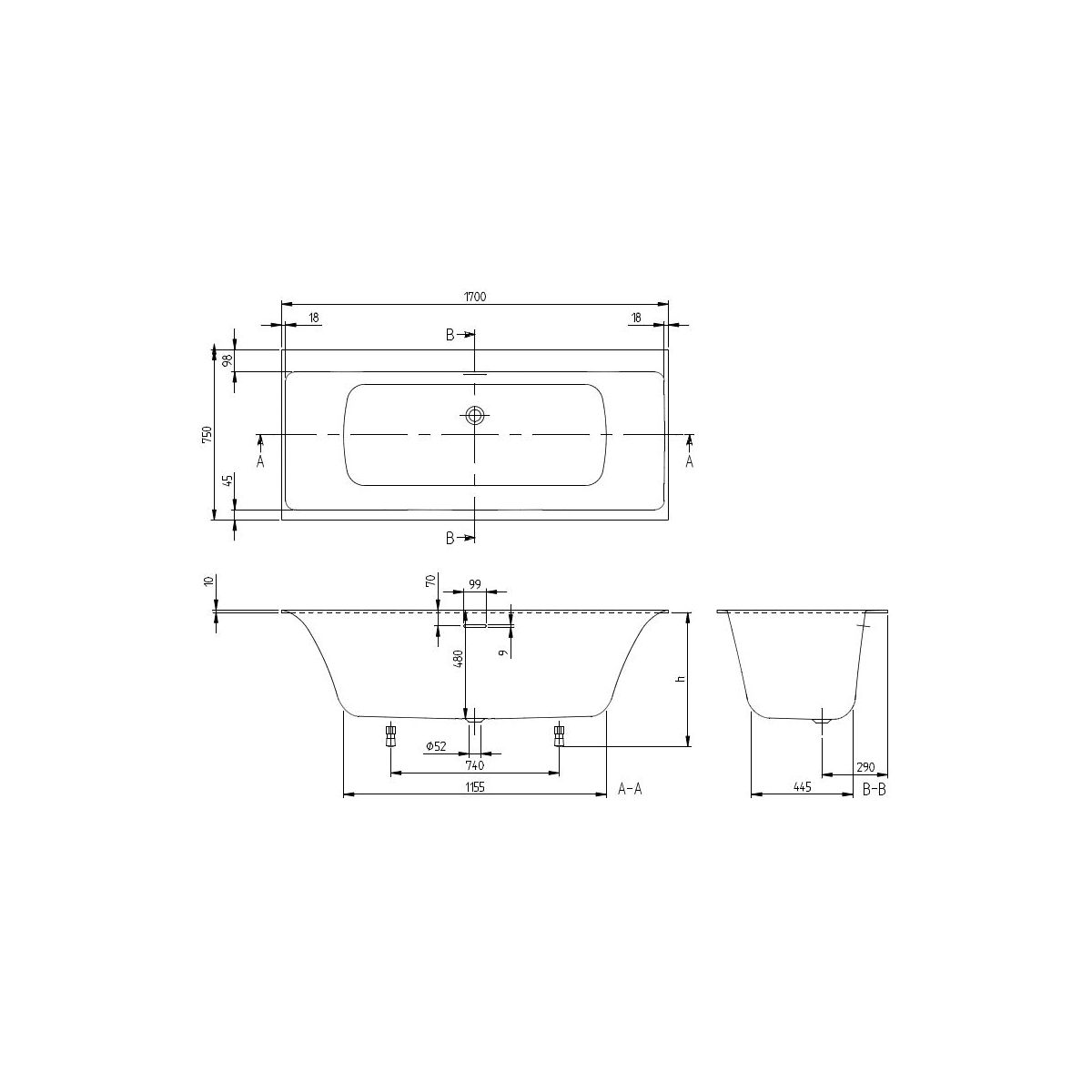 - Maße des Wannenbodens: 115,5 x 44,5 cm
