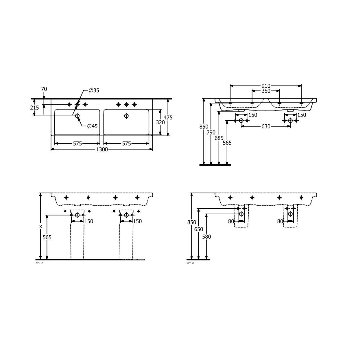 Villeroy & Boch Subway 3.0 Waschbecken 130x47 cm rechteckig Klassisch-Doppelt weiß 4A71D5R1