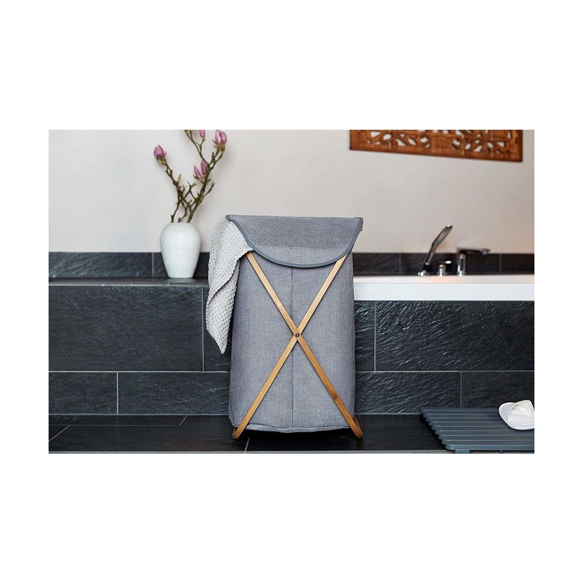 Der Wäschekorb spart dank seines zusammenklappbaren Gestells Platz im Badezimmer. Wenn er nicht gebraucht wird, kann er z. B. hinter dem Badezimmerschrank verstaut werden.