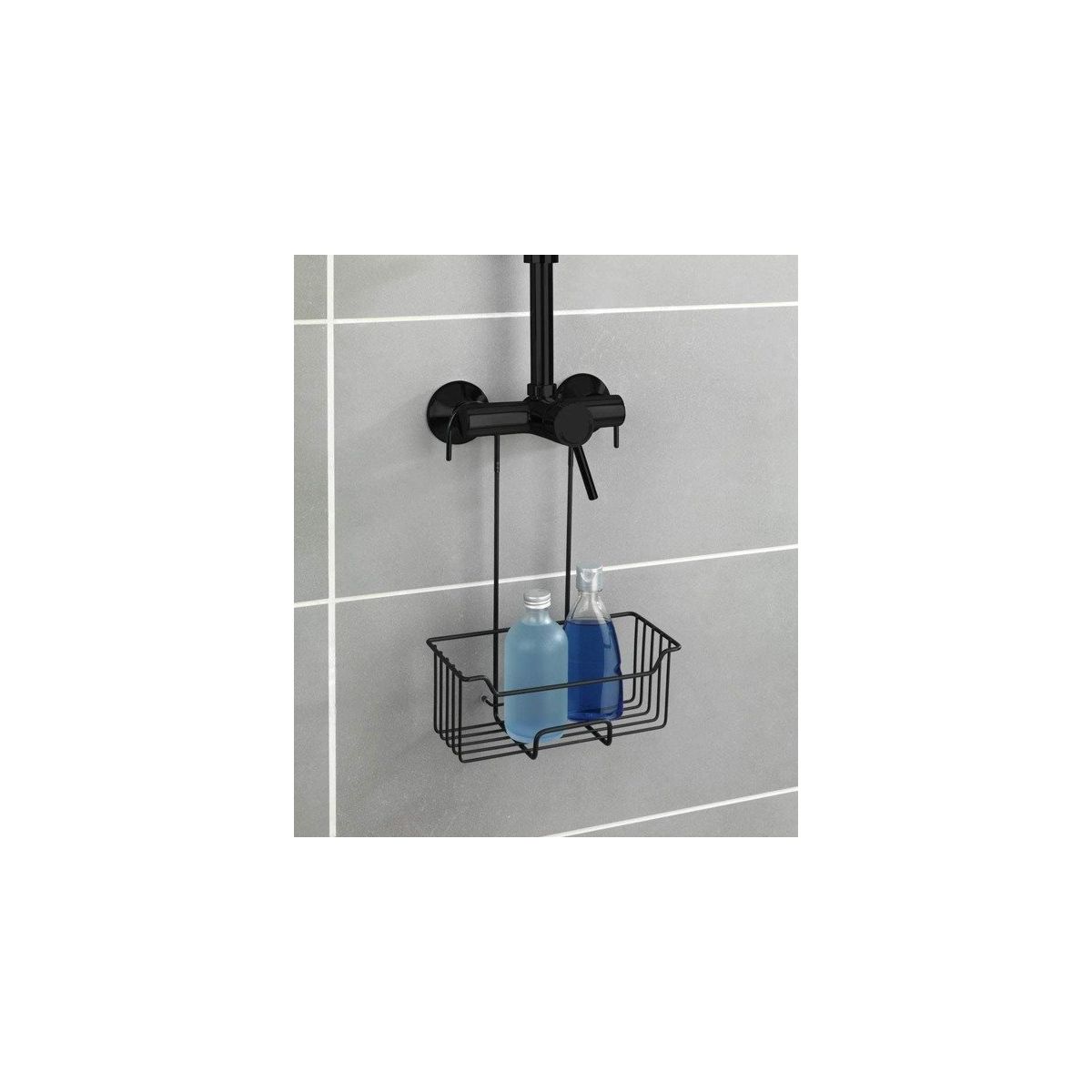 Badezimmerablage, die an der Duscharmatur befestigt wird. Der Korb mit einer Ablagefläche bietet zusätzlichen Platz im Badezimmer für verschiedene kleine Accessoires. Das Gitter verhindert, dass sich unnötiges Wasser am Boden des Korbs ansammelt.