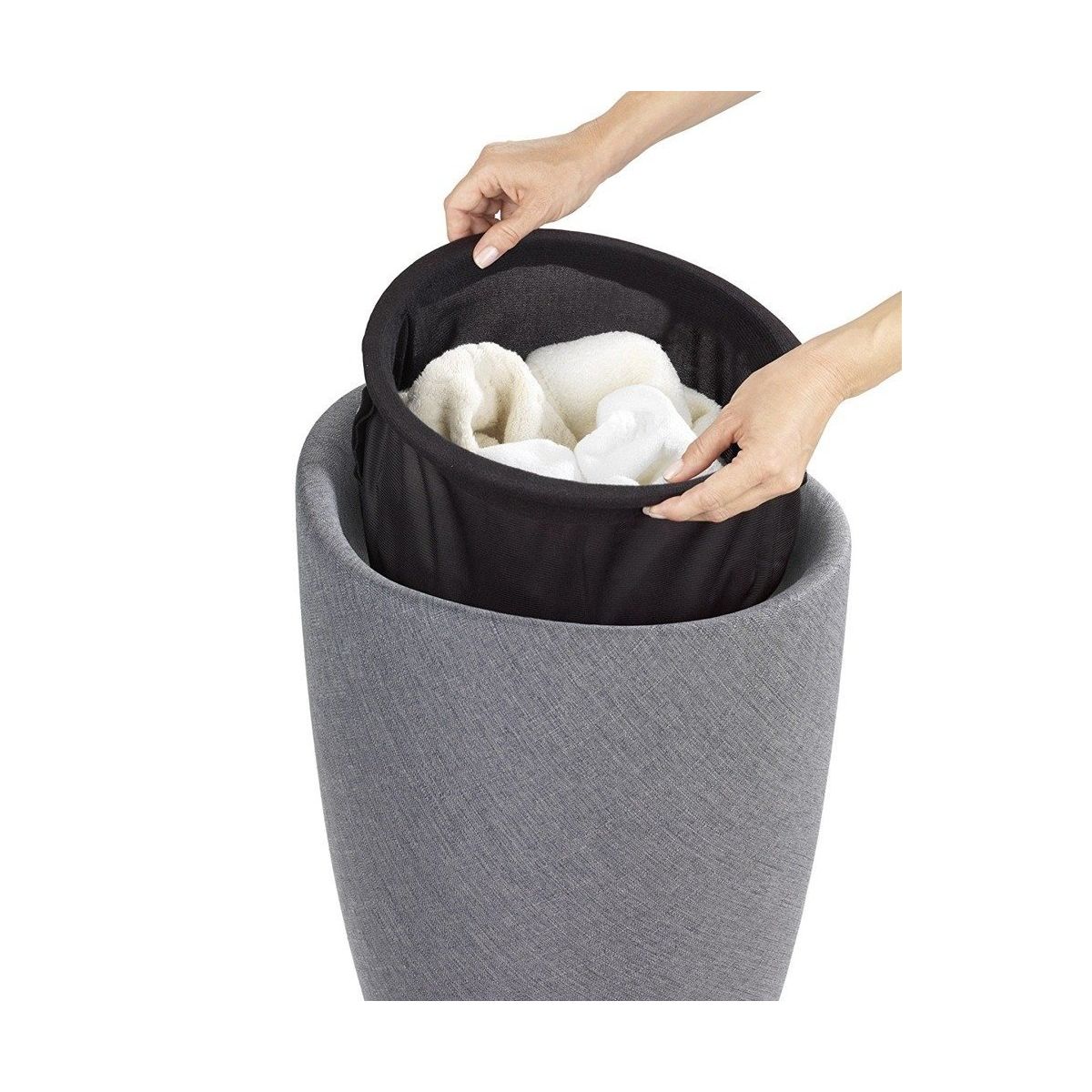 Der Wäschekorb kann gleichzeitig als Badezimmersitz dienen. Der Inneneinsatz ermöglicht ein bequemes Herausnehmen des Inhalts.
