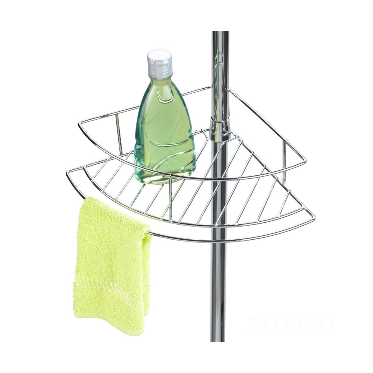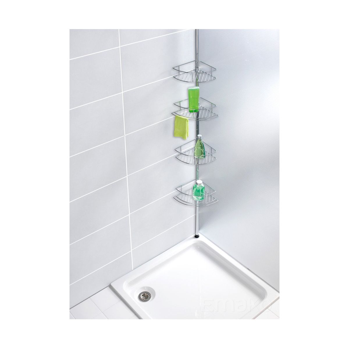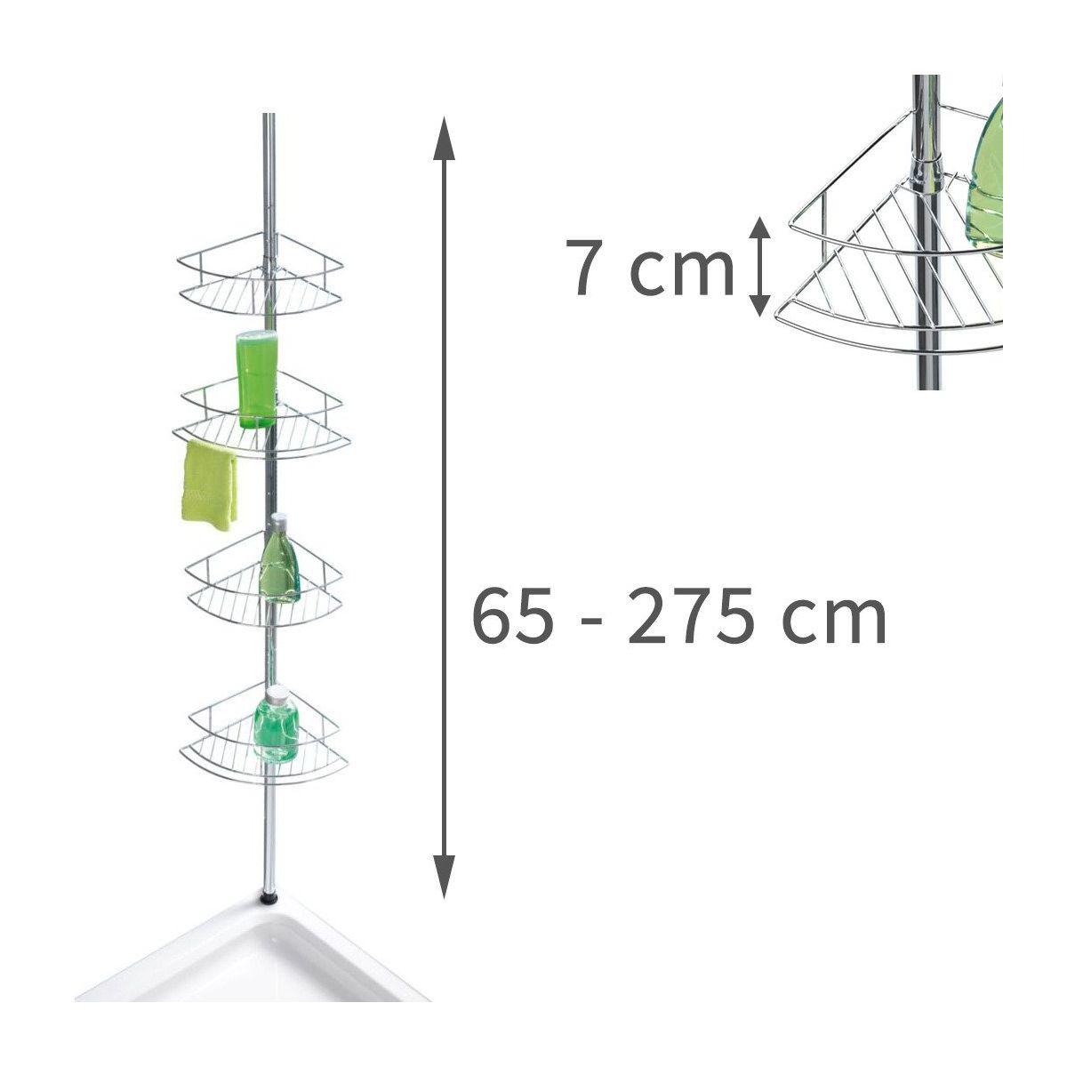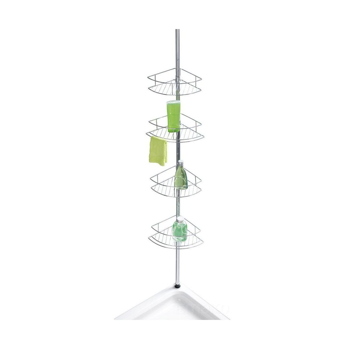 Das teleskopische Badezimmerregal mit 4 Ebenen bietet Platz für viele Kosmetika. Es eignet sich für die Montage in der Ecke der Badewanne und in der Duschkabine. Die Montage erfordert weder Bohren noch Kleben – das Regal wird einfach durch Einklemmen der Stange zwischen Boden und Decke befestigt. Die gerippte Konstruktion sorgt für einen freien Abfluss des abtropfenden Wassers.