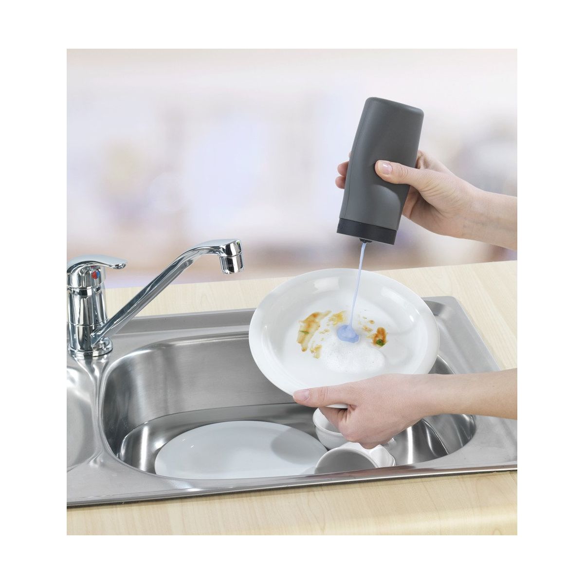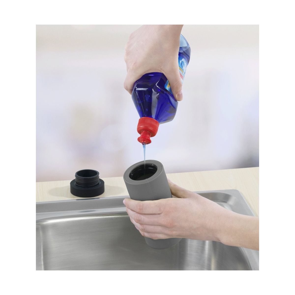 Der Spülmitteldosierer ist dank seiner Flexibilität beim Geschirrspülen besonders praktisch. Er kann auch als Behälter für Seife oder Duschgel verwendet werden. Er ermöglicht es, die gewünschte Flüssigkeitsmenge entsprechend den Vorlieben des Benutzers zu entnehmen.