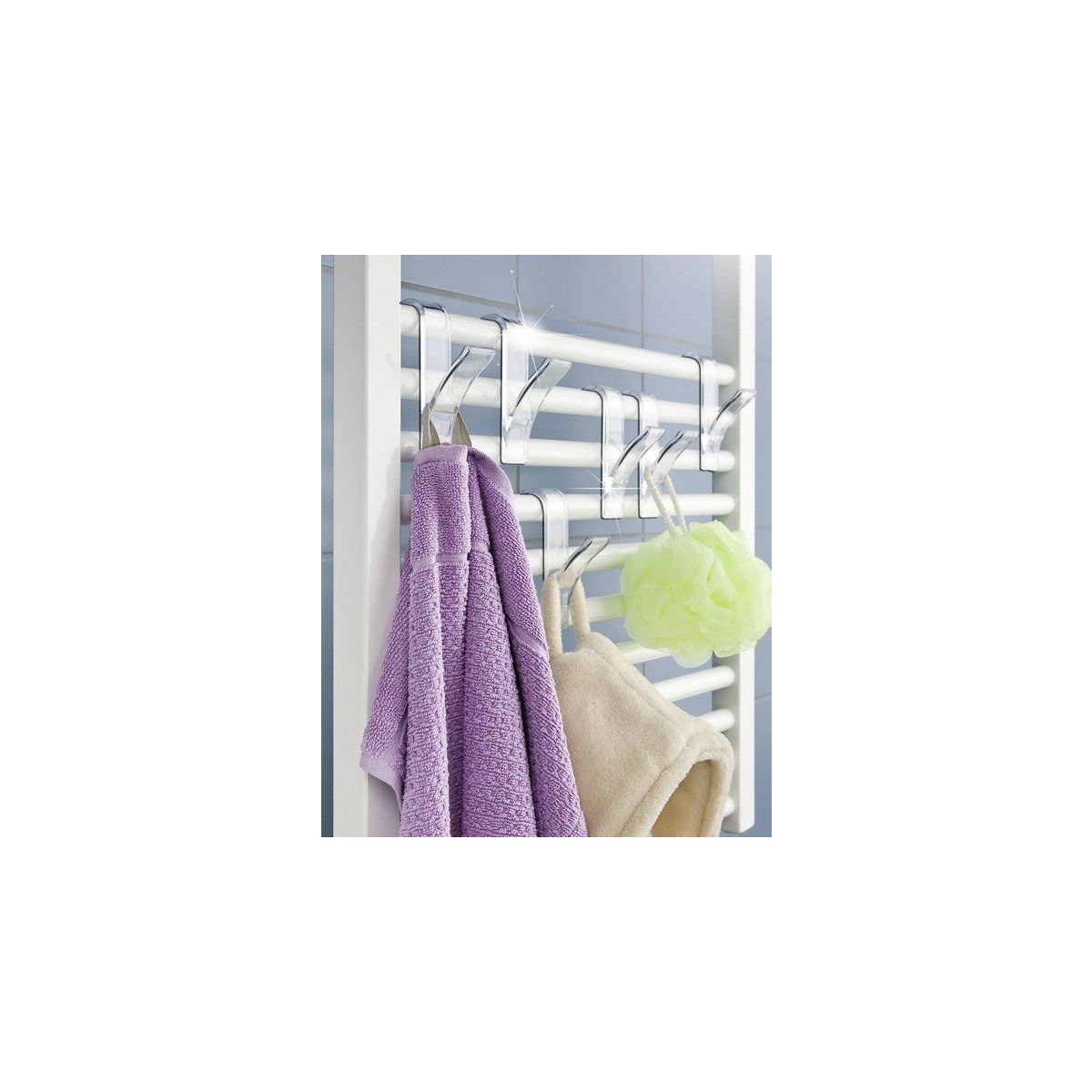 2 Haken zum Aufhängen von Handtüchern oder Kleidung am Heizkörper.