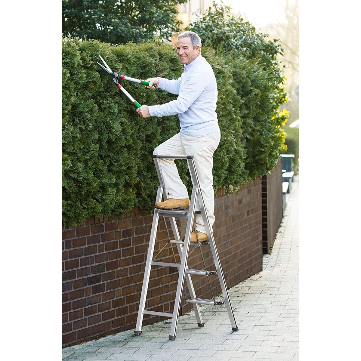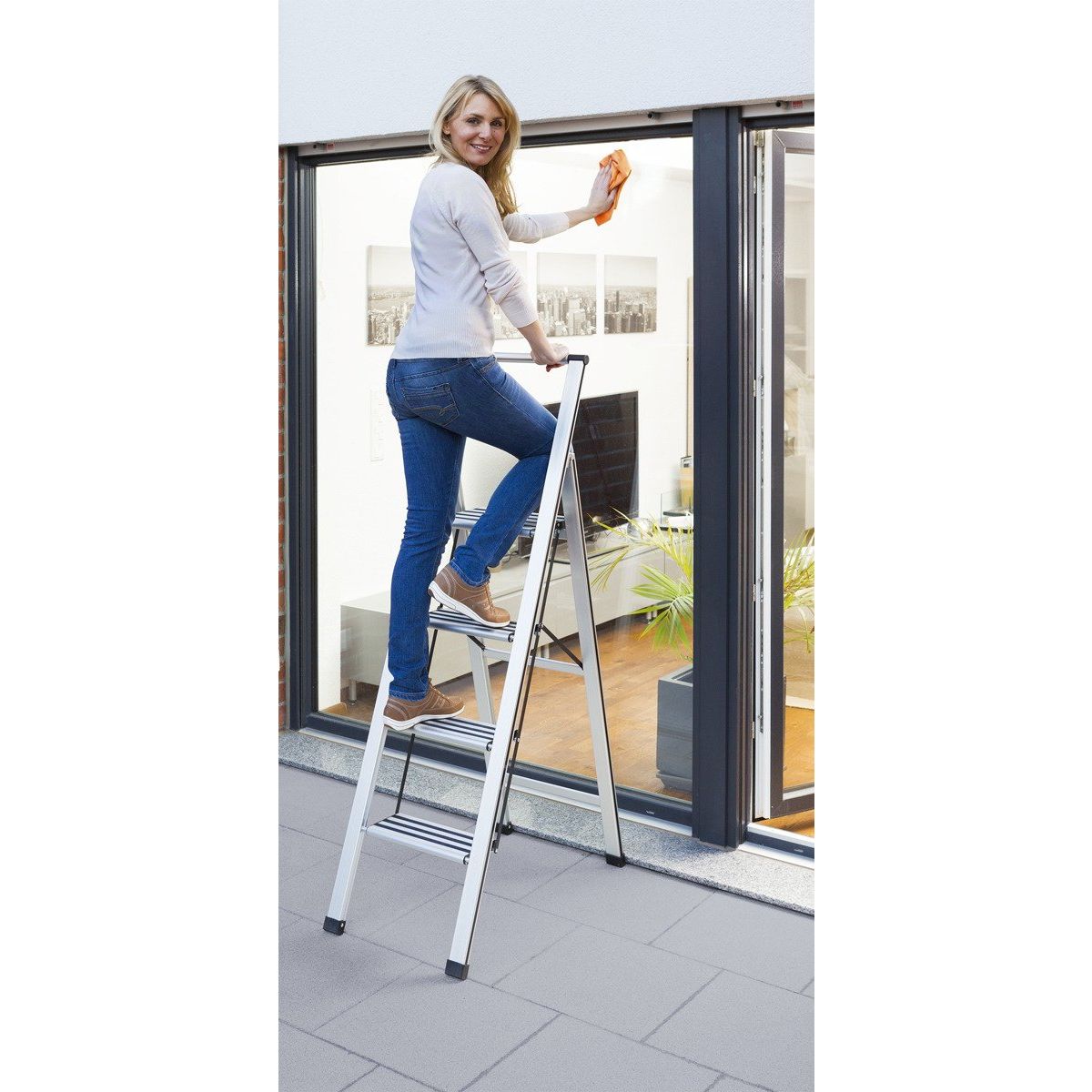 Die vierstufige Leiter mit rutschfester Oberfläche ermöglicht es Ihnen, sicher nach hoch gelegenen Gegenständen zu greifen. Sie kann auch bei Hausarbeiten wie z. B. Fensterputzen eine Erleichterung sein.