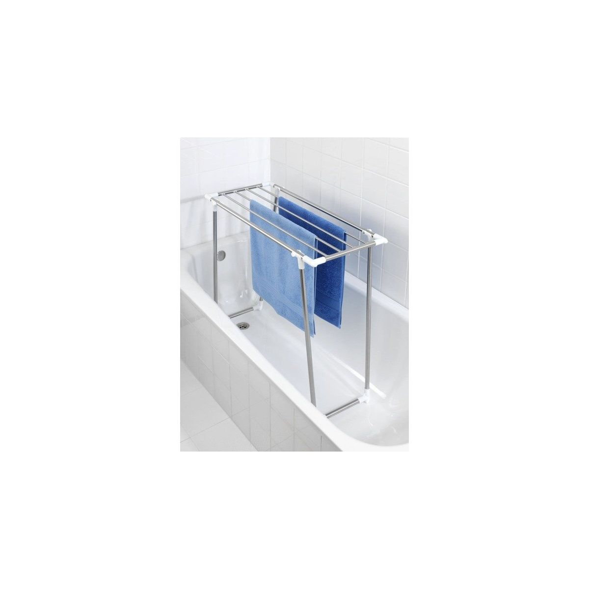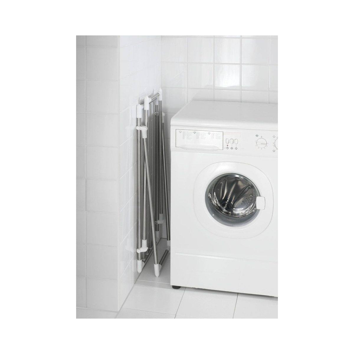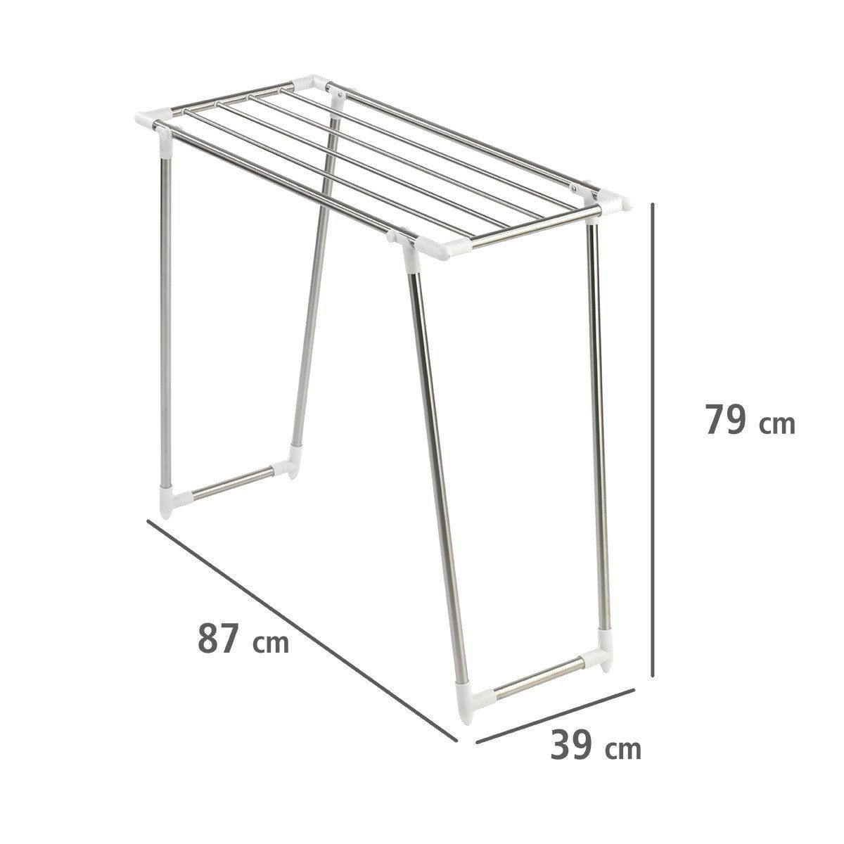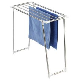 Silberfarbener Wäschetrockner. Die Gesamtfläche zum Trocknen beträgt 5,5 Meter. Ausgestattet mit einem einfachen Mechanismus zum Auf- und Zusammenklappen. Dank seiner Breite kann der Trockner an jedem beliebigen Ort aufgestellt werden.