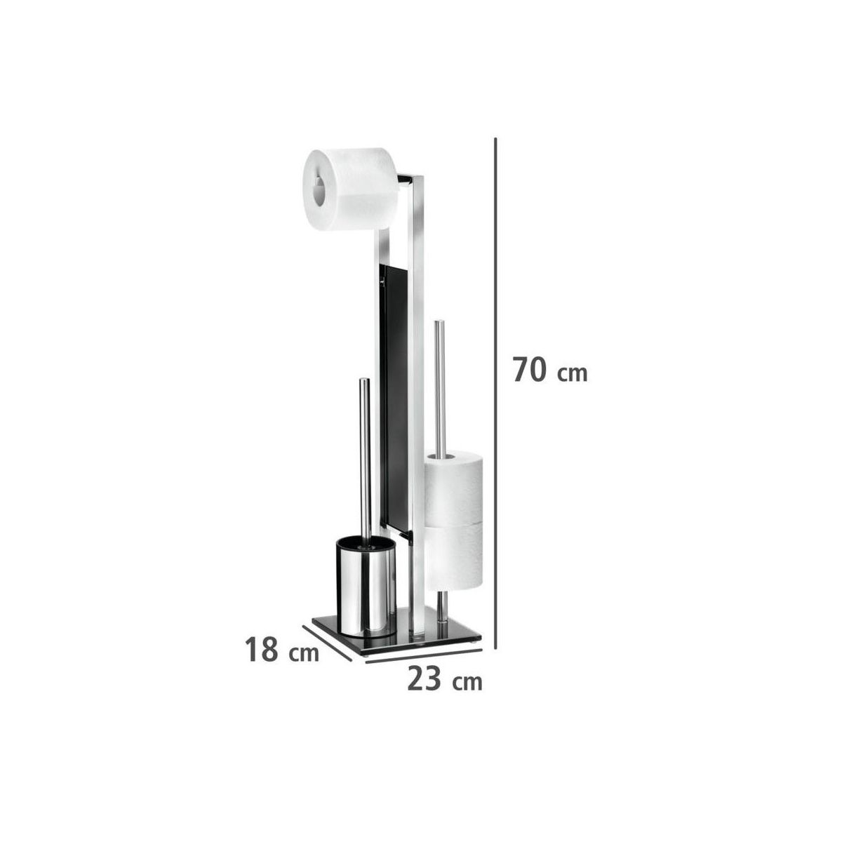 Auf dem hohen Ständer befindet sich eine Toilettenpapierhalterung. Zusätzlich bietet die Stange Platz für bis zu drei Ersatzrollen. Das Set wird durch eine Toilettenbürste mit austauschbarem Kopf in Standardgröße ergänzt.