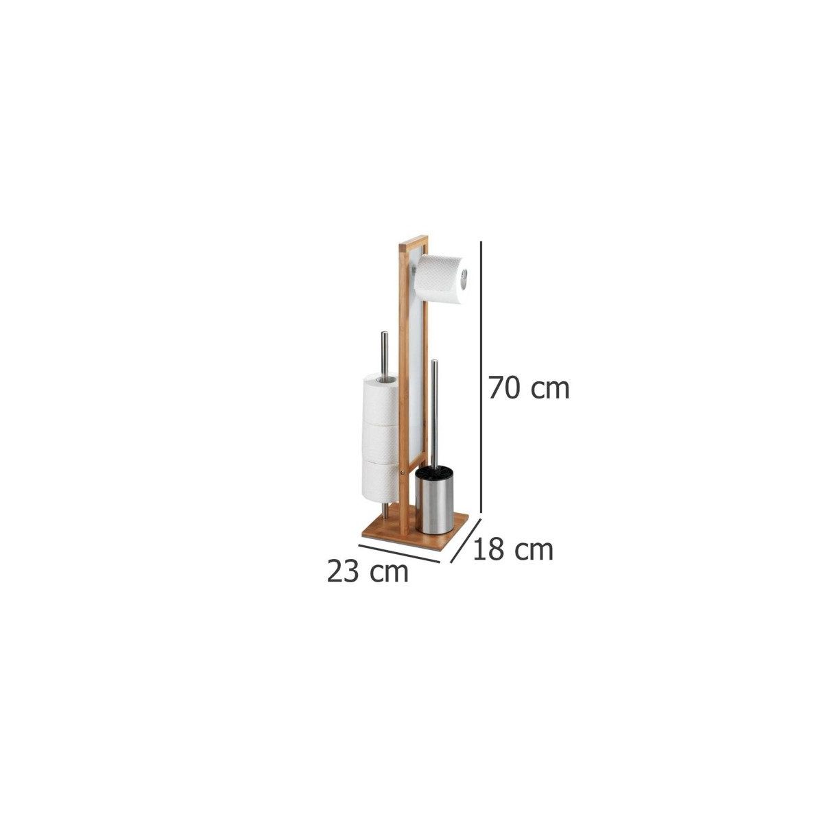 Der freistehende Badständer Rivalta umfasst einen Toilettenpapierhalter und eine Toilettenbürste mit Behälter. Das Produkt verfügt außerdem über eine Halterung, an der Ersatzpapierrollen angebracht werden können.