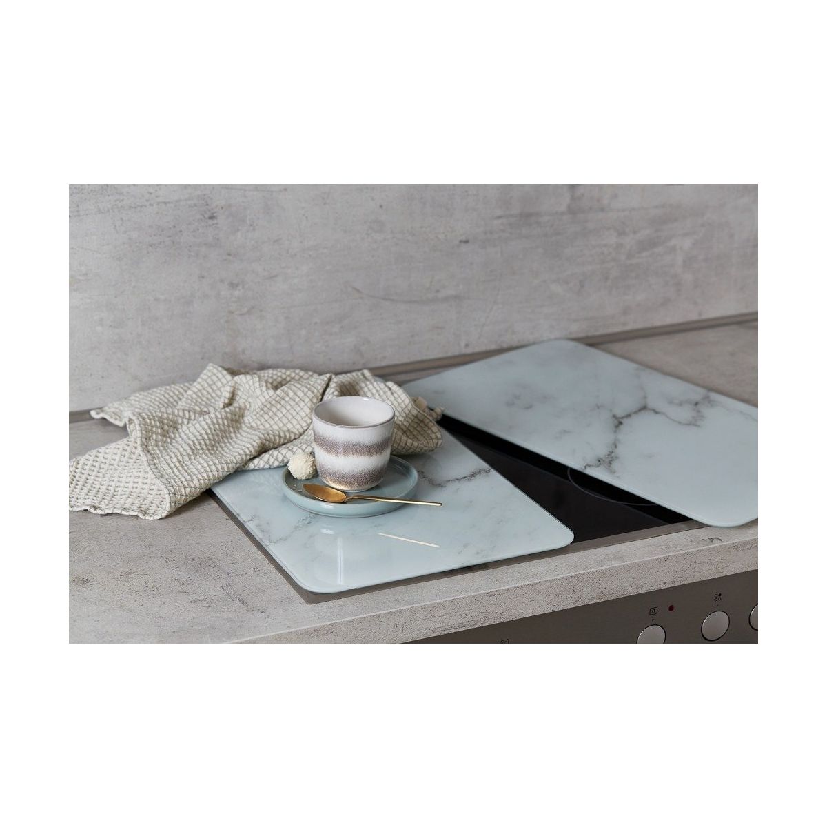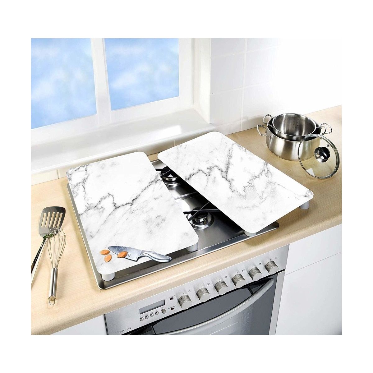 Glasplatten schützen den Herd vor Beschädigungen und bieten gleichzeitig eine zusätzliche Arbeitsfläche. Mit den im Set enthaltenen Silikonfüßen kann die Abdeckung auch bei höheren Kochfeldern verwendet werden. Die Platten sind für den Kontakt mit Lebensmitteln geeignet und können daher auch als Schneidebretter für Obst oder Gemüse verwendet werden.