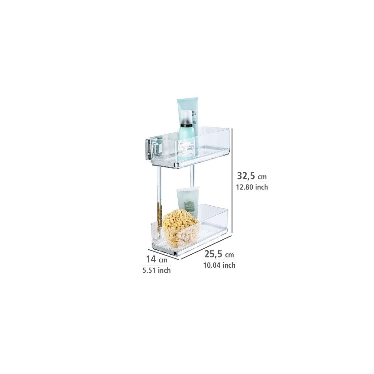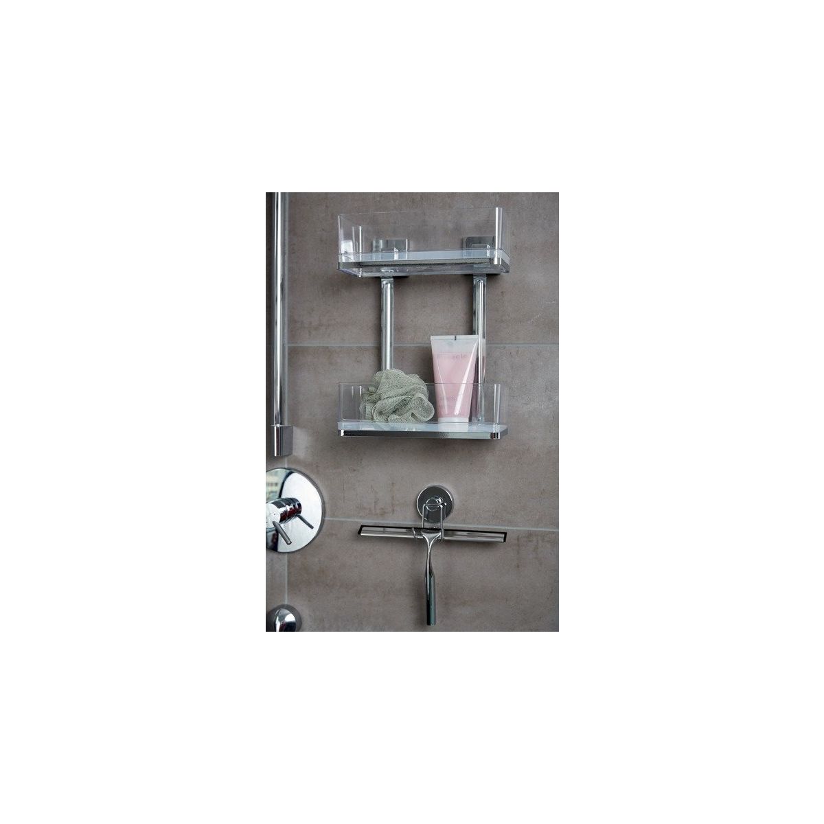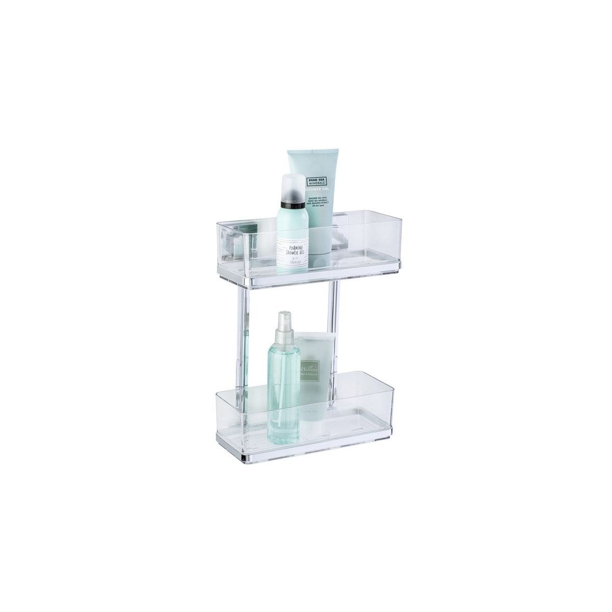 Das zweistufige Regal, das unter der Dusche angebracht wird, sorgt dafür, dass Sie die notwendigen Pflegeprodukte immer griffbereit haben.
