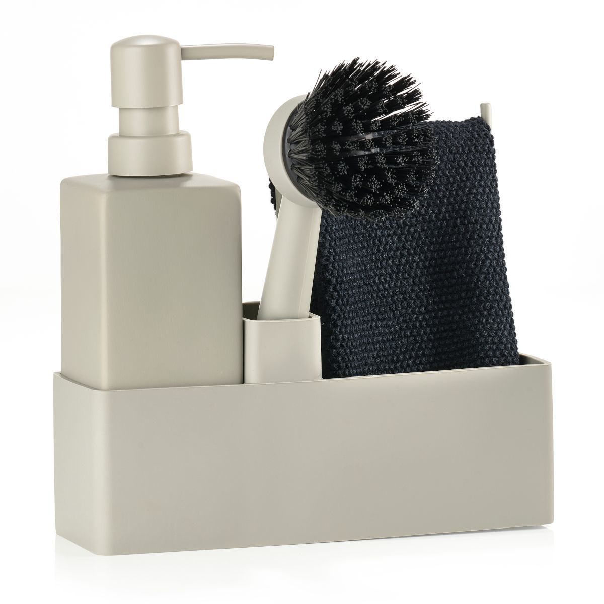 - Im Set enthalten sind ein Seifenspender aus Keramik, eine Zahnbürste mit austauschbarem Aufsatz sowie ein Organizer mit einem Reinigungstuch