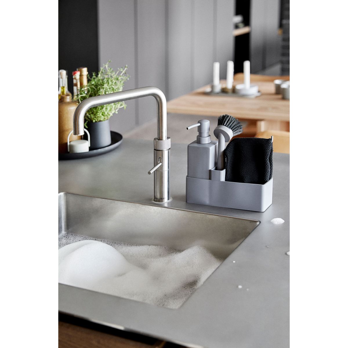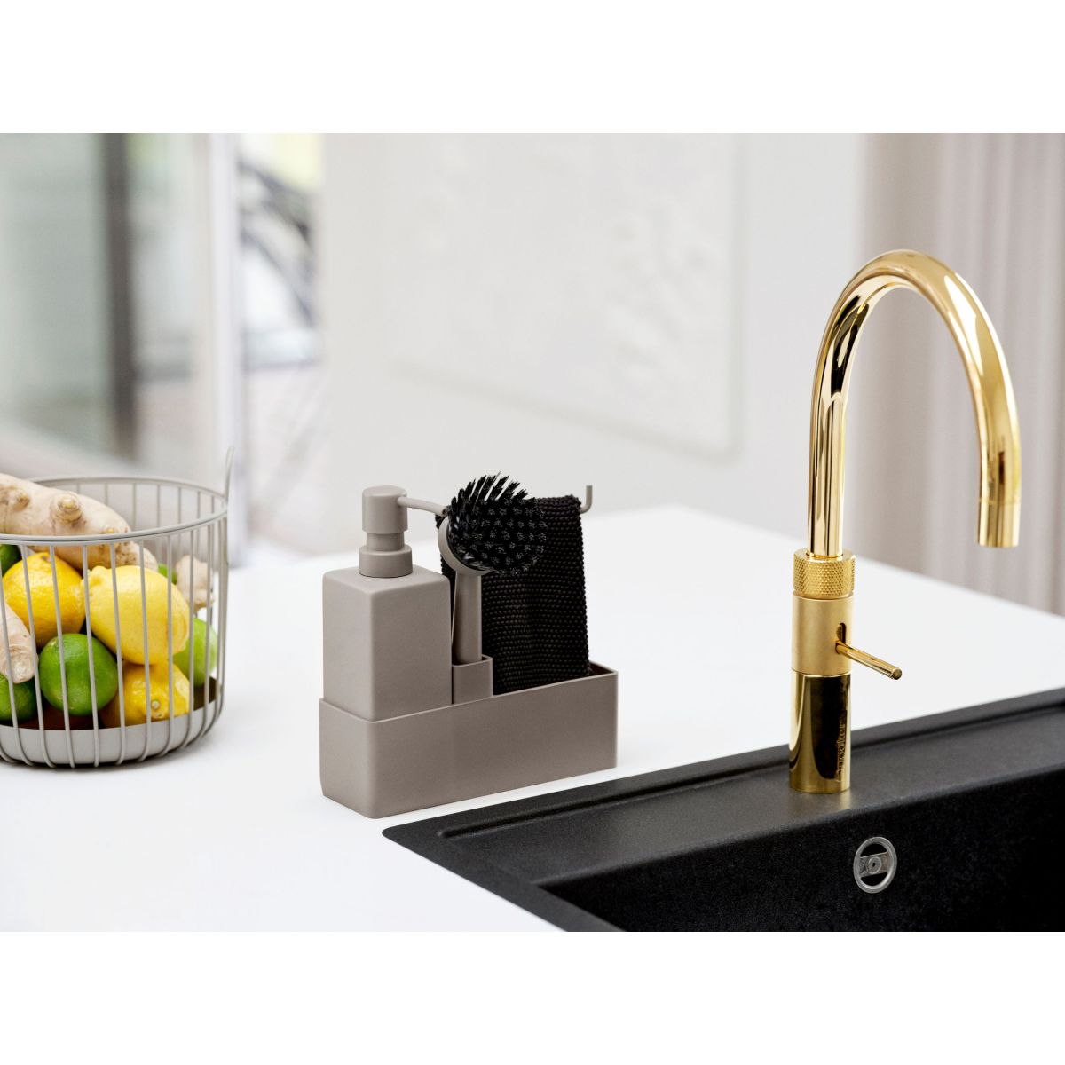- Im Set enthalten sind ein Seifenspender aus Keramik, eine Zahnbürste mit austauschbarem Aufsatz sowie ein Organizer mit einem Reinigungstuch